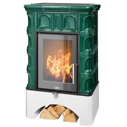 - Kachlová kamna klasického designu s litinovým čelem a dvířky.
