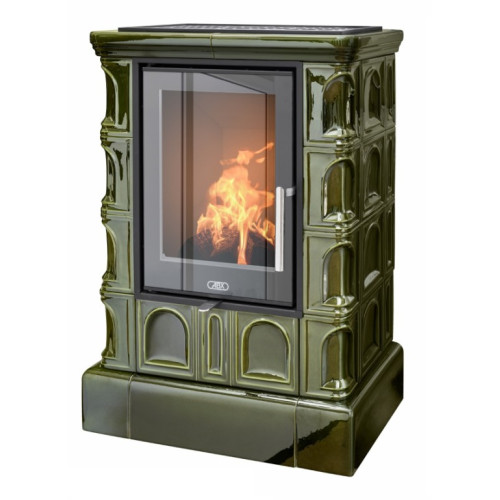 - Kachlová kamna klasického designu s litinovým čelem a dvířky.
