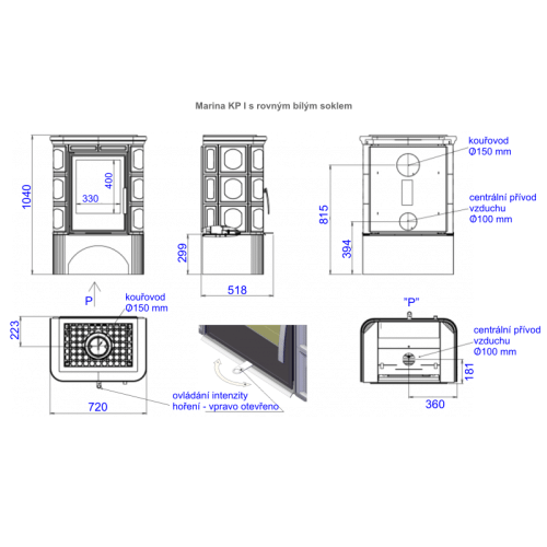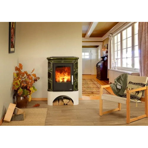Kachlová kamna klasického designu s litinovým čelem a dvířky.