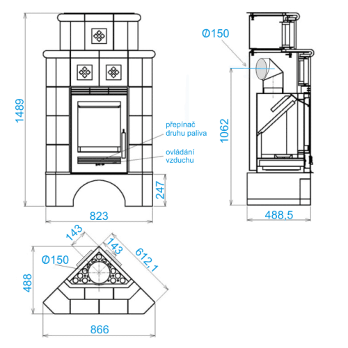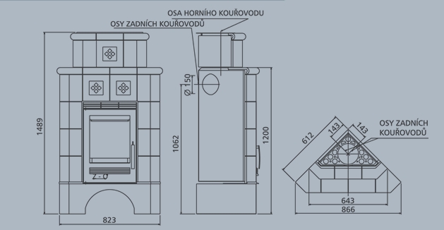 Kouřovod - Průměr vývodu je 150 mm (možnost horního i zadního napojení).