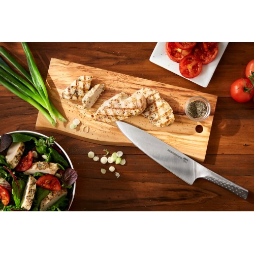 Čepel z vysoce kvalitní nerezové oceli je dostatečně robustní, aby si poradila s tvrdšími surovinami, ale zároveň tak jemně broušená, že s ní zvládnete i tenké plátky cibule. Ergonomická rukojeť zajišťuje, že i při práci s velkým nožem budete mít absolutní kontrolu nad každým řezem.