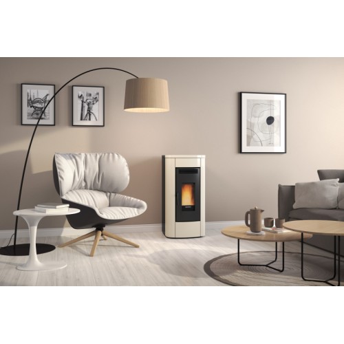 Lokální teplovzdušná kamna na pelety s automaticky regulovatelným výkonem a možností rozvodu teplého vzduchu do dalších místností. Ocelové opláštění má smaltovanou povrchovou úpravu v různých barevných odstínech. Tím je zaručena barevná i tvarová stálost obkladu. V horní části jsou kamna osazena kachlovým obkladem. Topeniště je osazeno litinovými dvířky s velkým panoramatickým prosklením. Předávání tepla je podpořeno distribučním ventilátorem, který lze modulovat pomocí integrované funkce. Tím je zaručena lepší cirkulace a rovnoměrnost tepla po místnosti a možnost rozptýlení tepla i do přilehlých místností. Litinová konstrukce spalovací komory zaručuje dlouhodobou životnost. Zásobník má kapacitu na 15 kg pelet a spotřeba paliva je od 0,7 do 1,8 kg / hod. Účinnost kamen převyšuje hranici 90 %. Součástí konstrukce je integrovaný termostat pro kontrolu a udržování nastavené teploty. Podle nastavené teploty uživatelem na displeji si kamna automaticky upravují množství přikládaných pelet a tím i samotný výkon kamen. Možnost nastavení týdenního programování zvyšuje komfort a umožňuje automatické zapínání a vypínání kamen i v případě nepřítomnosti obsluhy. Tím odpadá práce s přípravou palivového dřeva a zákazníkům je poskytnut komfortní a plně automatický provoz. Kamna se nabízí v různém barevném provedení obkladu. V ceně kamen je dálkový ovladač, který zvyšuje komfort obsluhy.