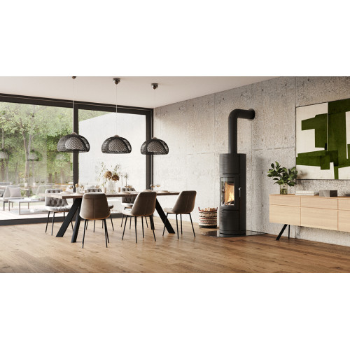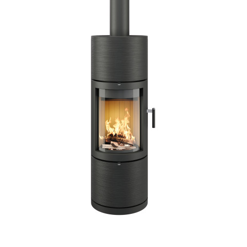 Elegantní, válcové litinové tělo vybavené decentními ovládacími prvky a velkým prosklením pro výhled na plameny. Kamna GREENA kombinují minimalistický design s funkční dokonalostí. Tato celolitinová kamna jsou k dispozici v povrchové úpravavě s vroubkovaným reliéfem připomínajícím kůru stromu. V horní části je umístěný teplovodní výměník, který je snadno přístupný k čištění.